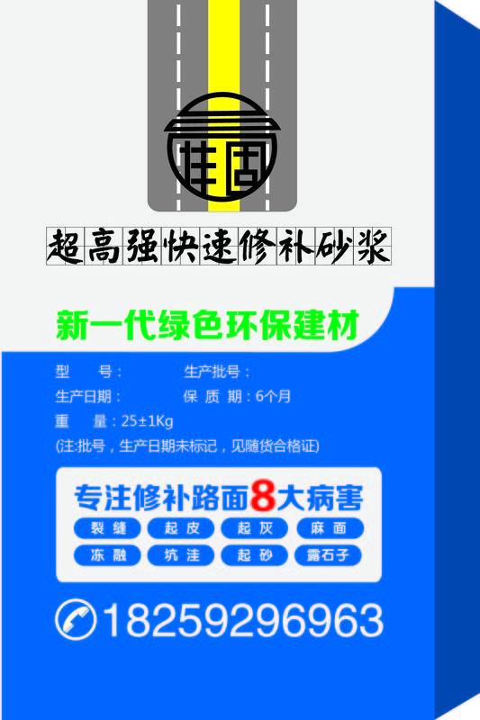 超高强快速砂浆2小时实行通车,专门针对水泥混凝土路面,起皮、空鼓、开裂、蜂窝、麻面、裂缝、起砂、冻融盐蚀引起的水泥路面露石、露筋等病害进行快速修补,有超强的抗压和粘接强度,可实现超薄层水泥路面快速修补,在高速和高压的行车状态下不会出现破碎和脱落现象。修补质量稳定,效果好,使用寿命有充分的保障。适用于预制构件、机场、高速公路、国道、省道、隧道、市政道路、城乡公路、工矿厂房、停车场、加油站、学校、球场、小区道路等混凝土地面。